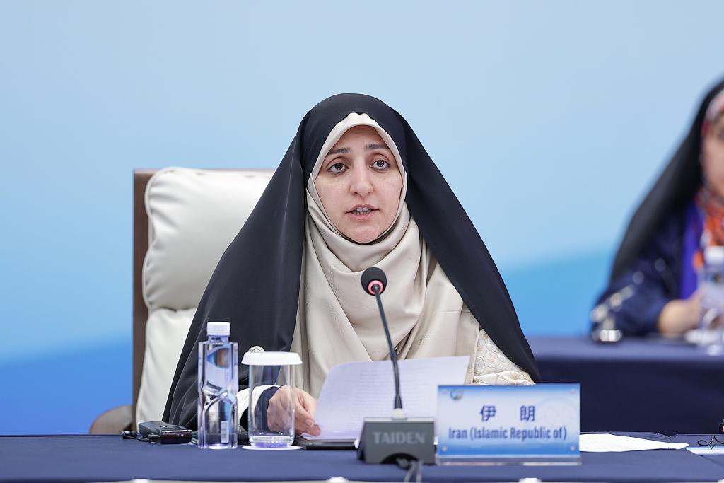 13日、世界女性サミットの全體會議であいさつするイランの代表。(北京=新華社記者/張玉薇)