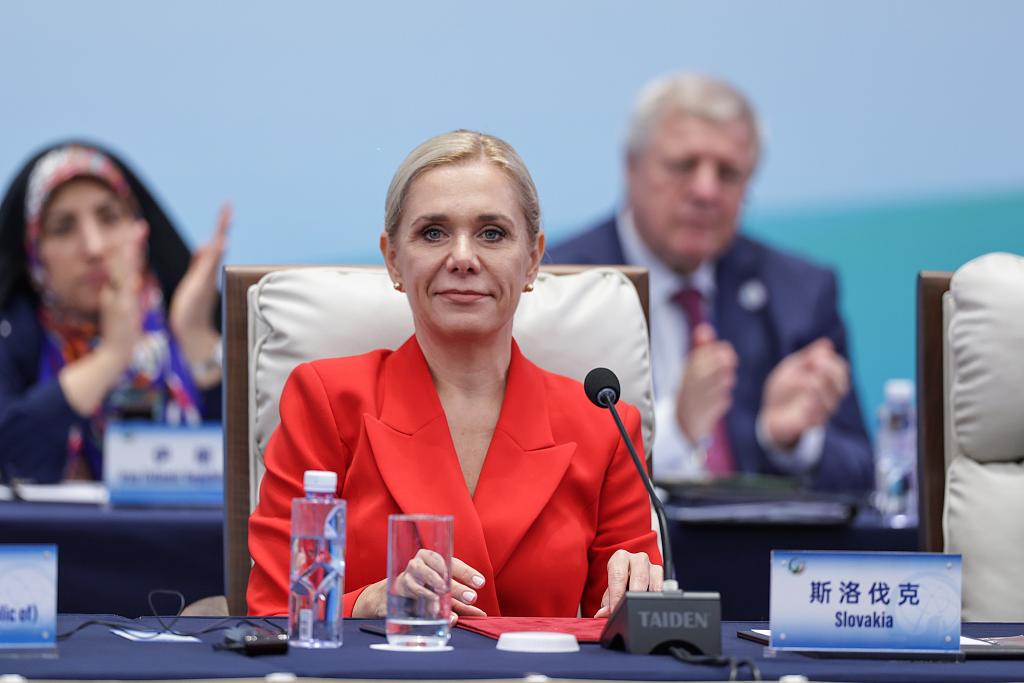 13日、世界女性サミットの全體會議であいさつするスロバキアの代表。(北京=新華社記者/張玉薇)