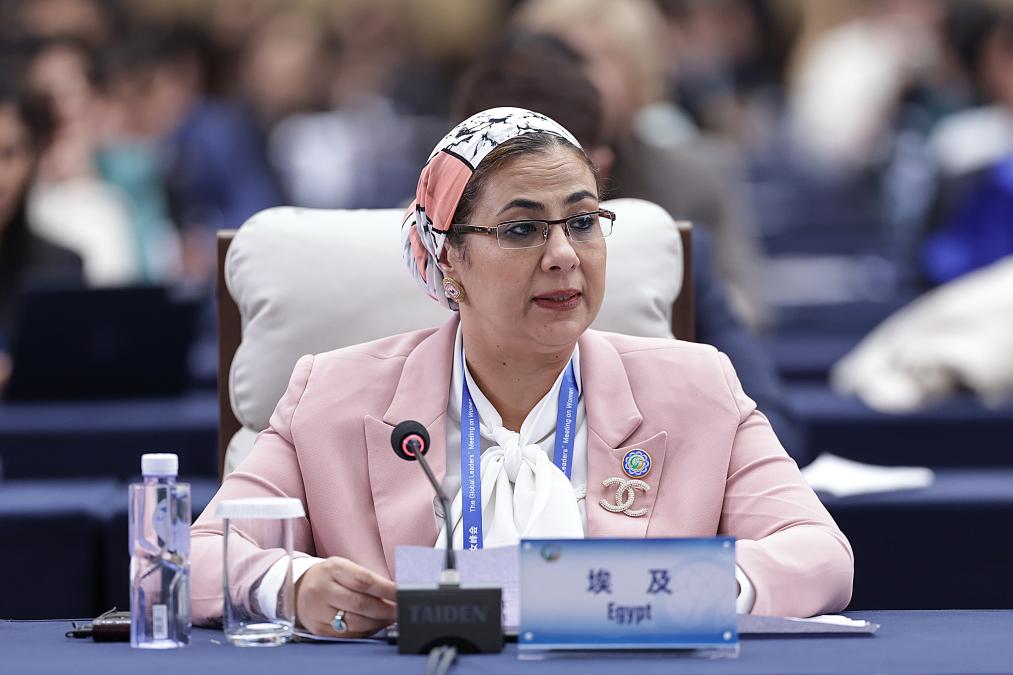 13日、世界女性サミットの全體會議であいさつするエジプトの代表。(北京=新華社記者/張玉薇)