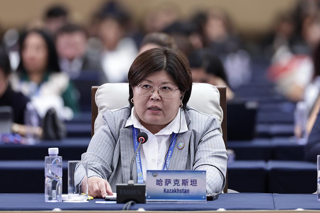 13日、世界女性サミットの全體會議であいさつするカザフスタンの代表。(北京=新華社記者/張玉薇)