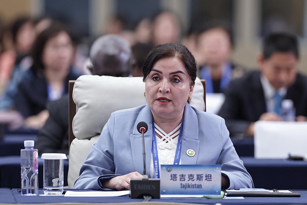 13日、世界女性サミットの全體會議であいさつするタジキスタンの代表。(北京=新華社記者/張玉薇)