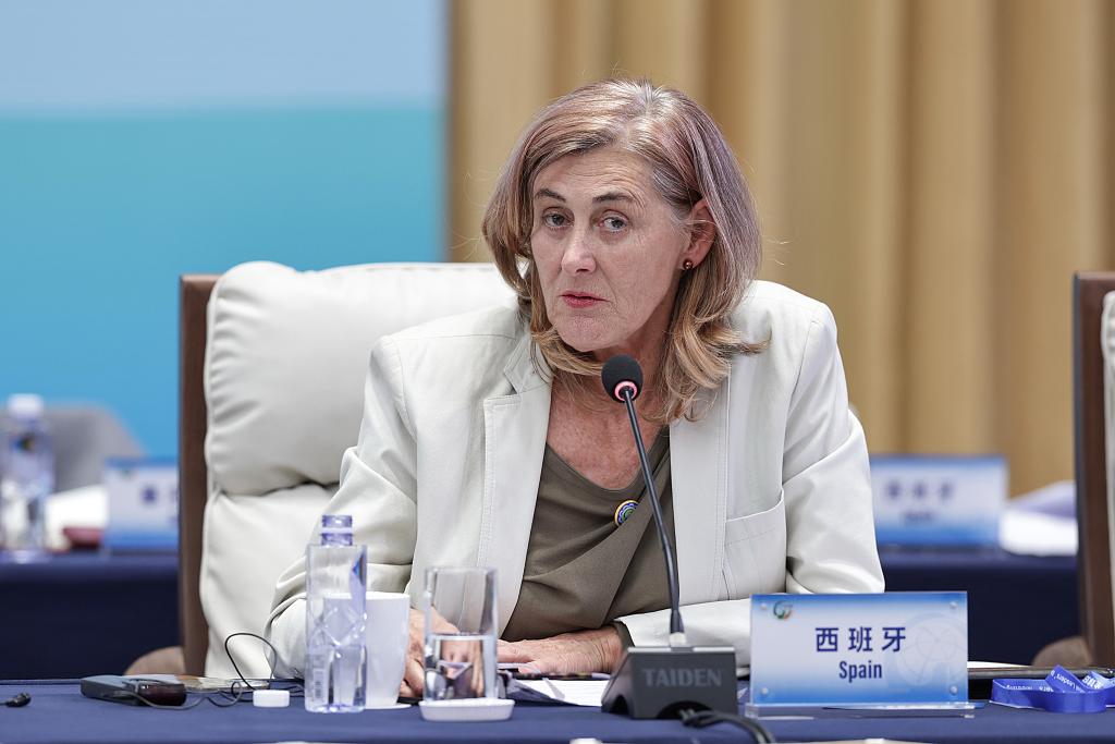 13日、世界女性サミットの全體會議であいさつするスペインの代表。(北京=新華社記者/張玉薇)