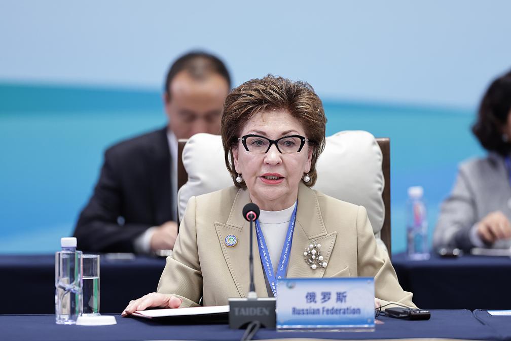 13日、世界女性サミットの全體會議であいさつするロシアの代表。(北京=新華社記者/張玉薇)