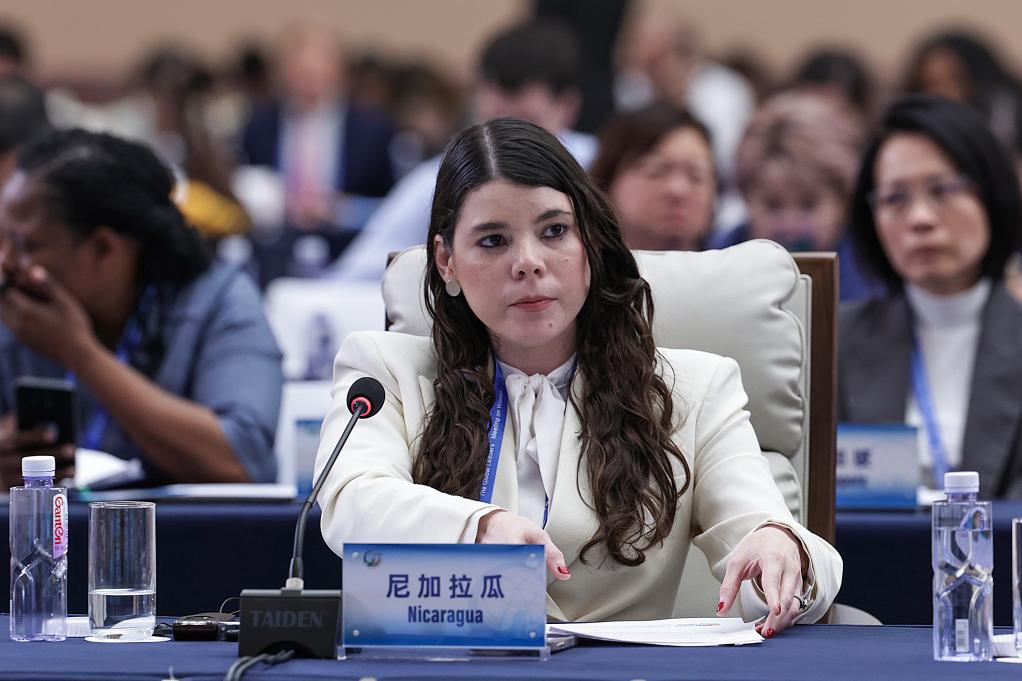 13日、世界女性サミットの全體會議であいさつするニカラグアの代表。(北京=新華社記者/張玉薇)