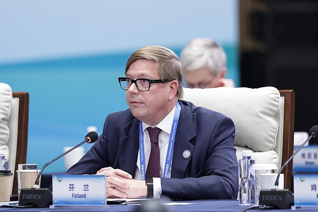 13日、世界女性サミットの全體會議であいさつするフィンランドの代表。(北京=新華社記者/張玉薇)
