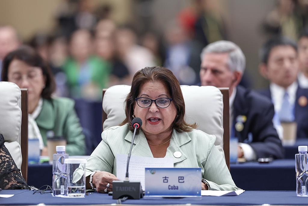 13日、世界女性サミットの全體會議であいさつするキューバの代表。(北京=新華社記者/張玉薇)