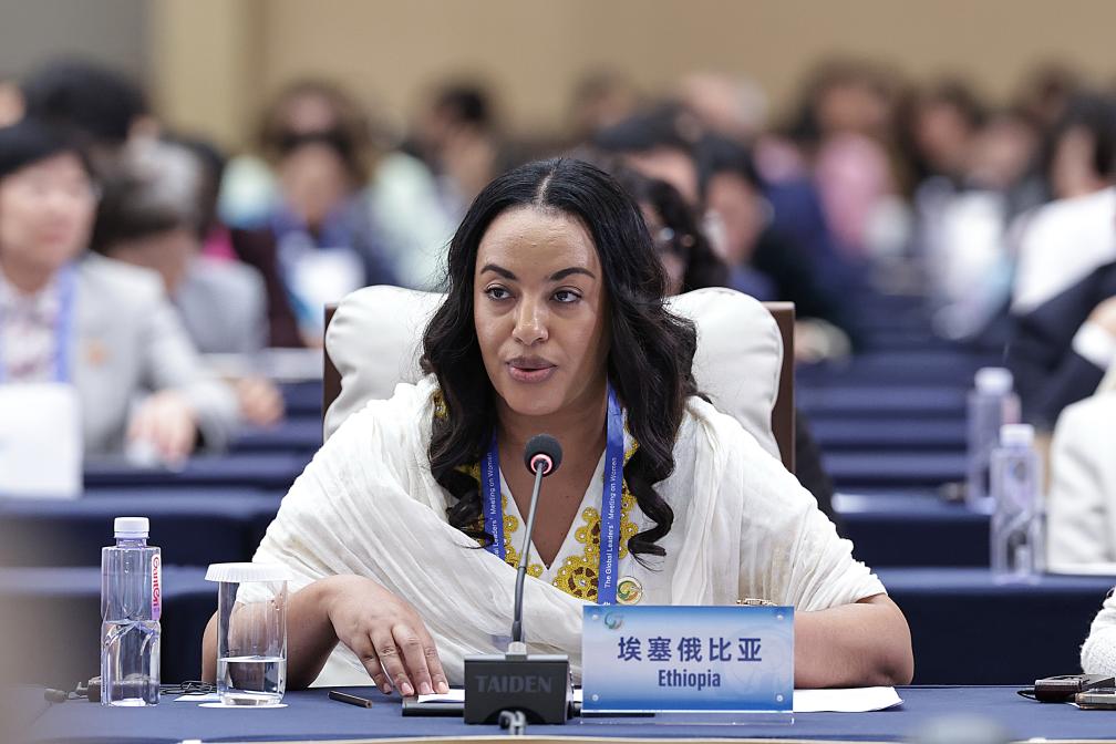 13日、世界女性サミットの全體會議であいさつするエチオピアの代表。(北京=新華社記者/張玉薇)