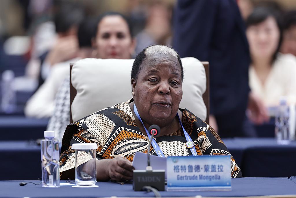 13日、世界女性サミットの全體會議であいさつする第4回世界女性會議のガートルード・モンゲラ事務局長。(北京=新華社記者/張玉薇)