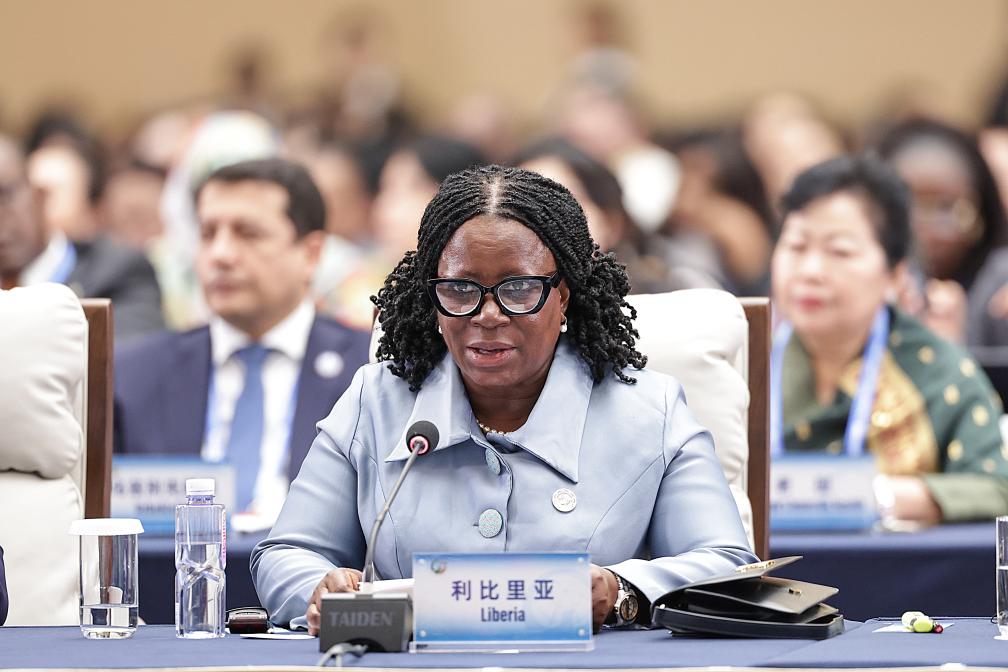 13日、世界女性サミットの全體會議であいさつするリベリアの代表。(北京=新華社記者/張玉薇)