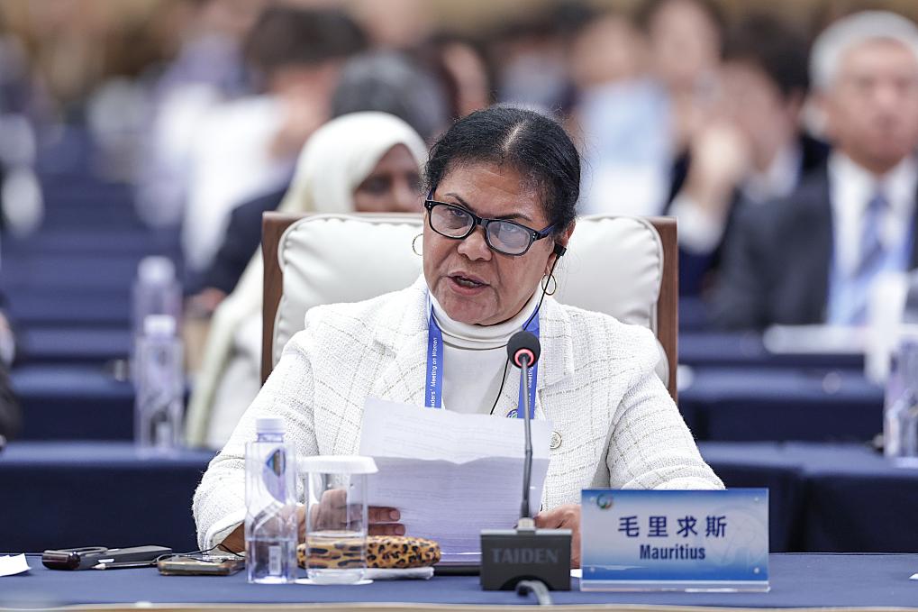 13日、世界女性サミットの全體會議であいさつするモーリシャスの代表。(北京=新華社記者/張玉薇)