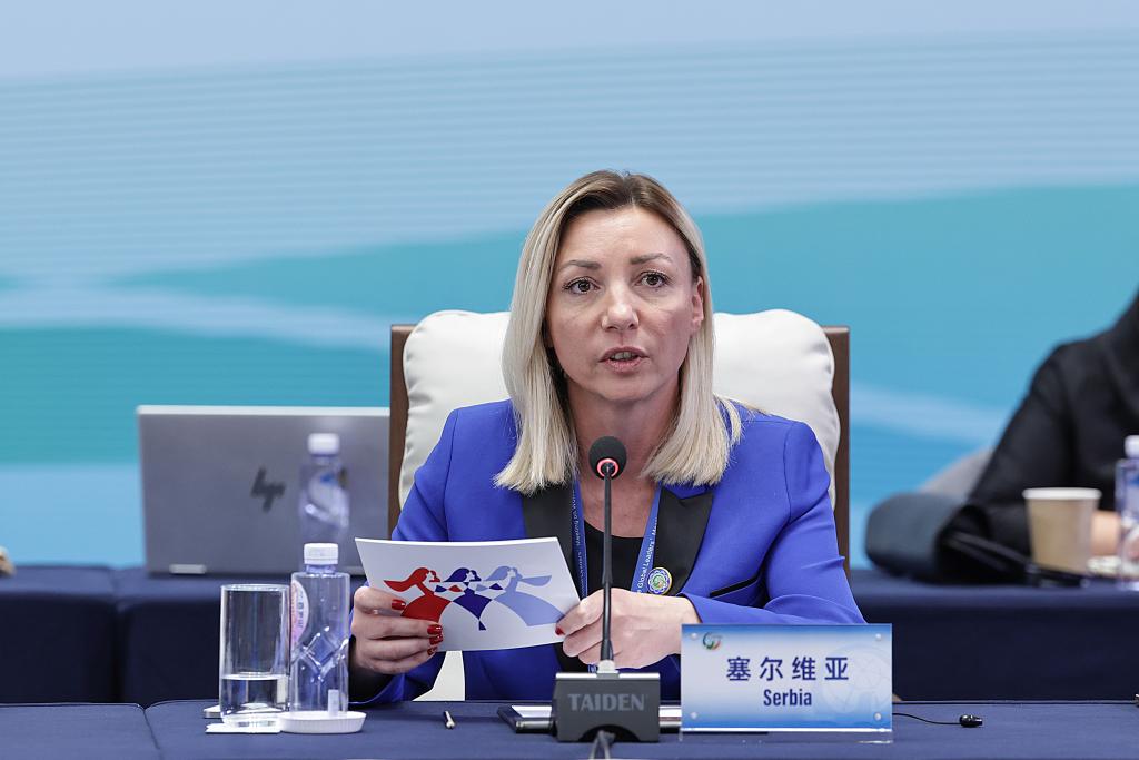 13日、世界女性サミットの全體會議であいさつするセルビアの代表。(北京=新華社記者/張玉薇)