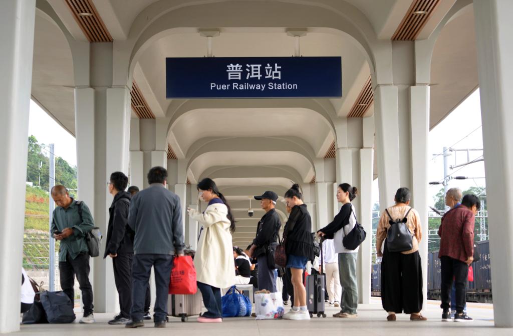 雲南省普洱駅で中國ラオス鉄道の列車を待つ人たち。(9月20日撮影、昆明=新華社記者/邢広利)