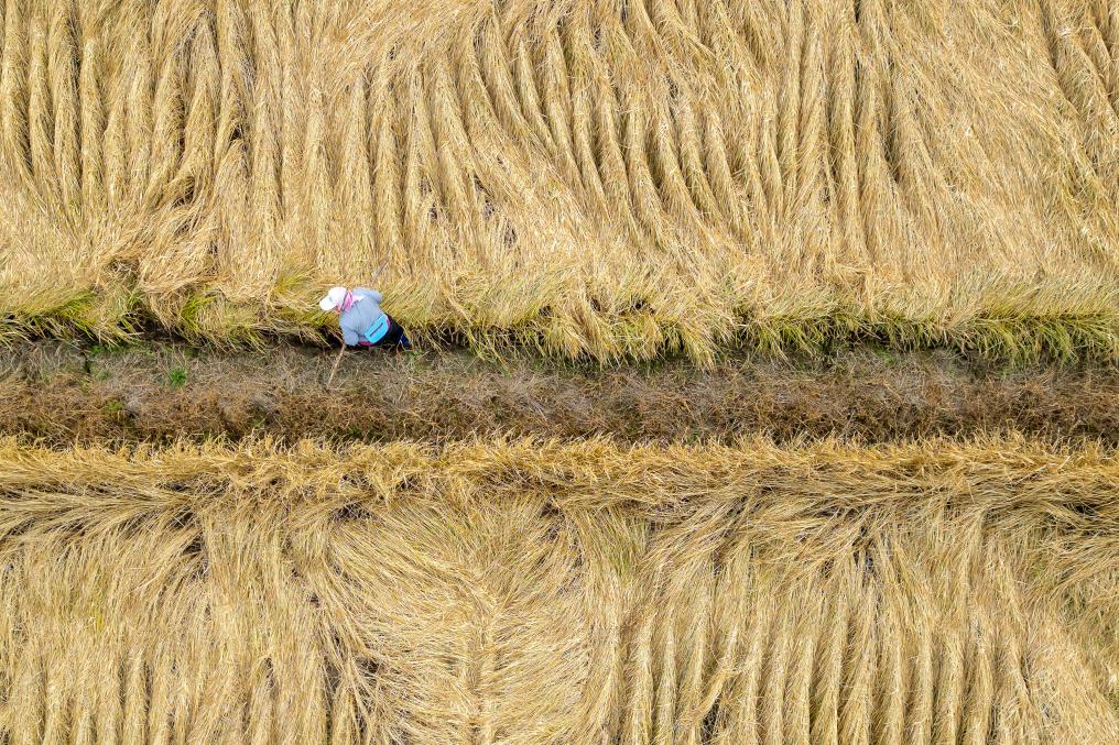14日、黒竜江省牡丹江市沙虎村の水田で、収穫の準備をする農家の人。(ドローンから、ハルビン=新華社記者/張濤)