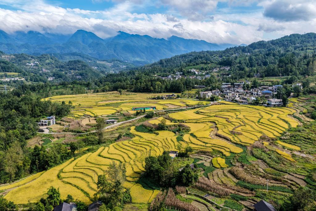 重慶市黔江區五里鎮の棚田。五里鎮の水稲の作付面積は5300ムー(約353ヘクタール)で武陵山地區の主要な食糧生産地の一つとなっている。(9月18日、ドローンから、重慶=新華社記者/唐奕)