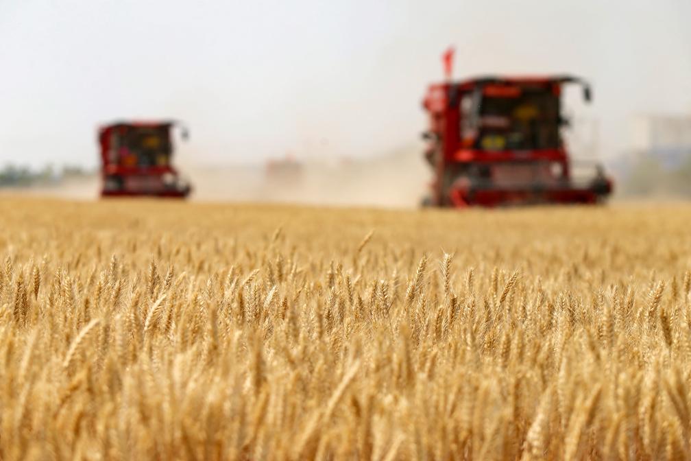 安徽省淮北市濉渓(すいけい)県で、小麥を収穫する収穫機。(5月28日撮影、淮北=新華社配信/萬善朝)