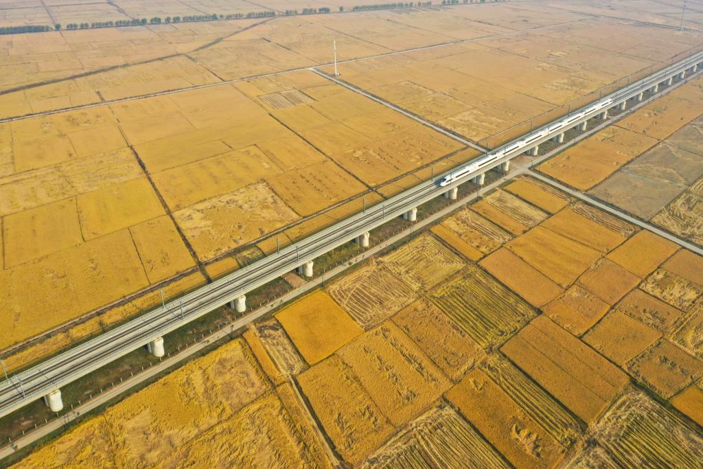 14日、吉林省公主嶺市で、田園地帯を走る高速鉄道の列車。(ドローンから、公主嶺=新華社記者/張楠)