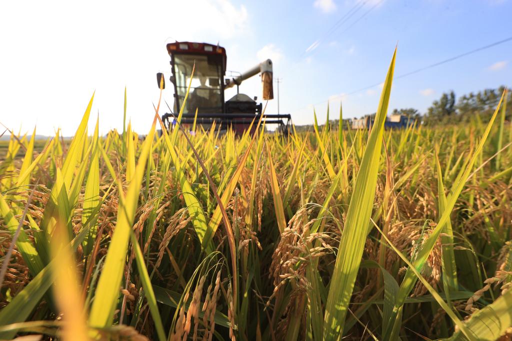 16日、江蘇省連雲港市城頭鎮で、水稲を収穫する収穫機。(連雲港=新華社配信/司偉)