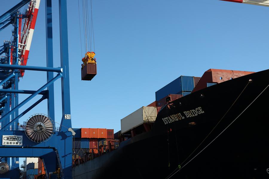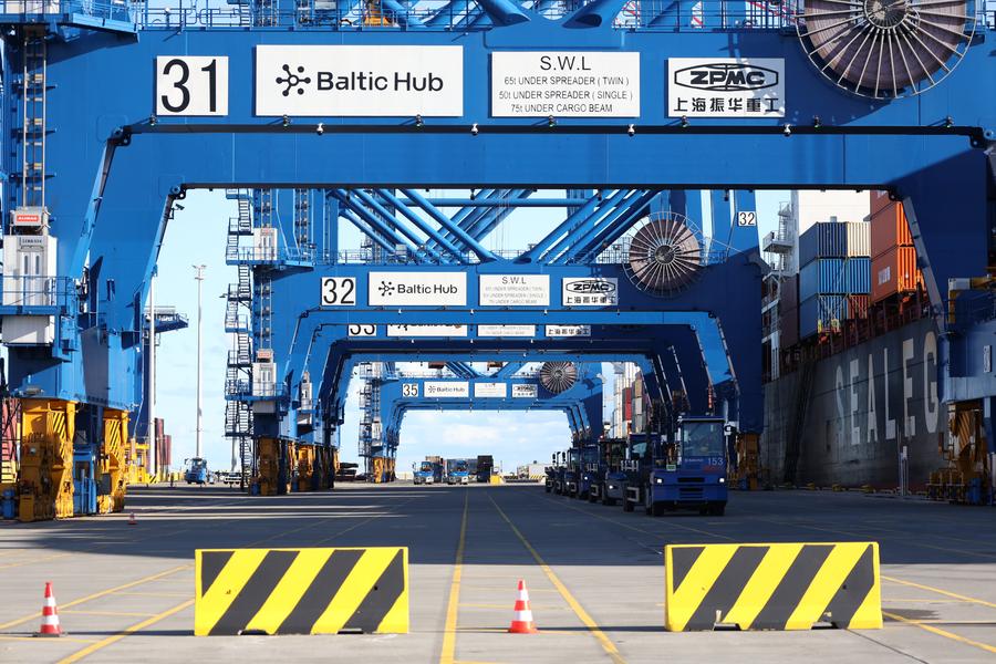 19日、ポーランド北部のグダニスク港で荷降ろし作業をする中歐北極海コンテナ航路の初便。(グダニスク=新華社記者/崔力)