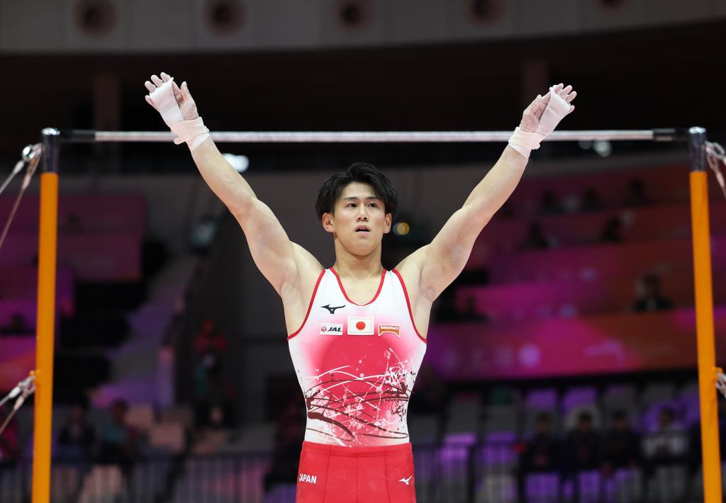 22日、鉄棒の演技を終えた橋本大輝。(ジャカルタ=新華社記者/白雪飛)