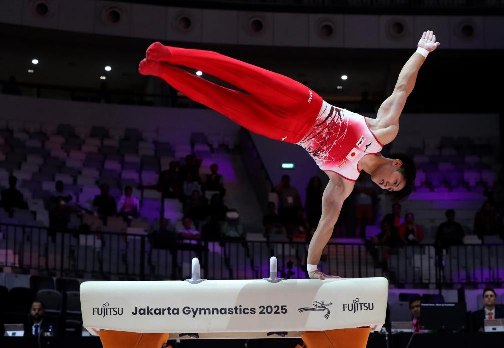 22日、あん馬の演技に臨む橋本大輝。(ジャカルタ=新華社記者/白雪飛)