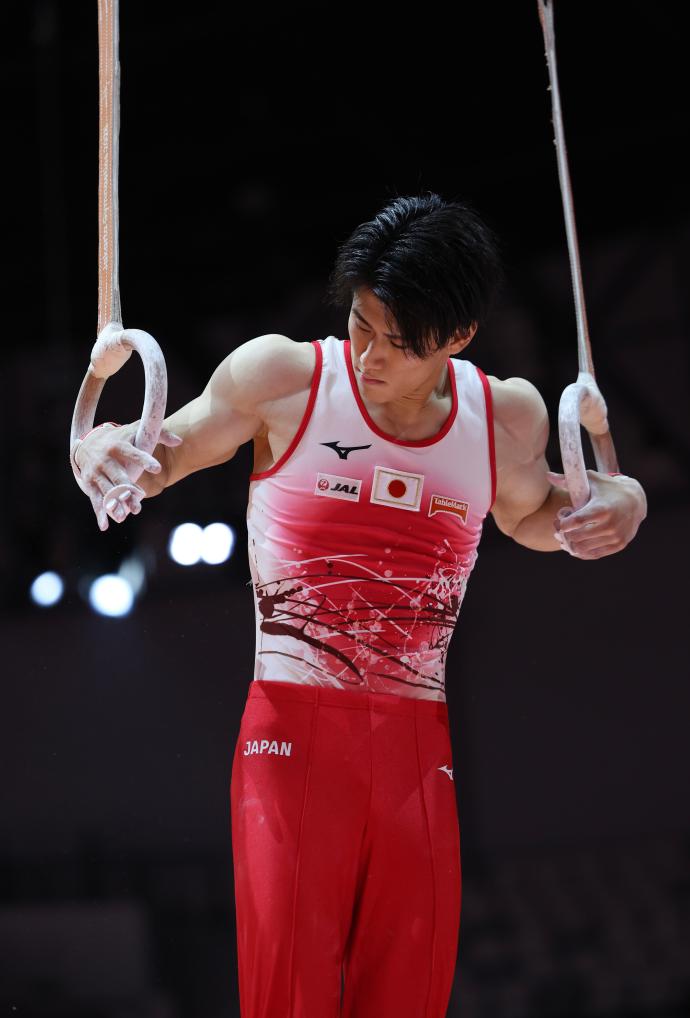 22日、つり輪の演技に臨む橋本大輝。(ジャカルタ=新華社記者/白雪飛)