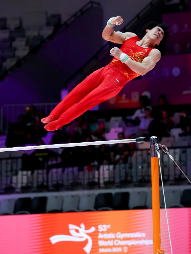 22日、鉄棒の演技に臨む張博恒。(ジャカルタ=新華社記者/白雪飛)