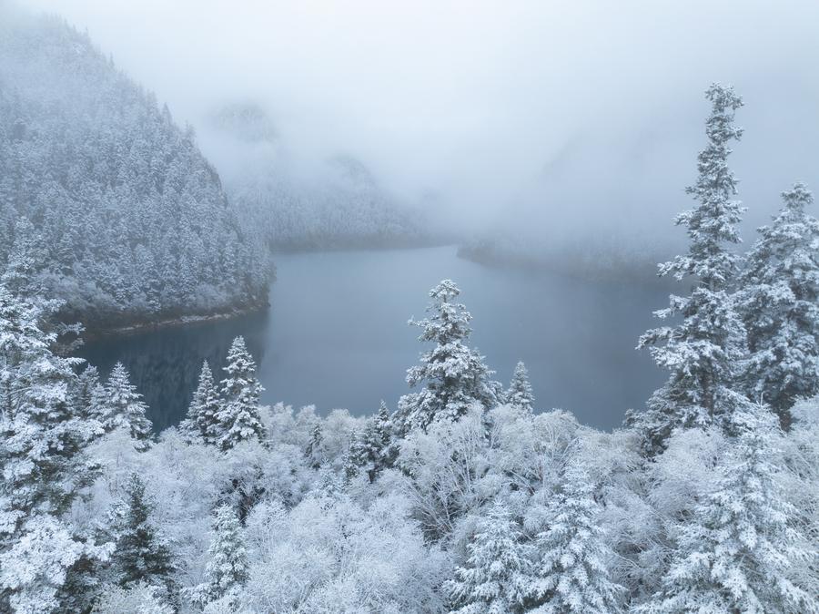 【新華社九寨溝10月25日】中國四川省アバ・チベット族チャン族自治州にある世界自然遺産の九寨溝でこのほど、雪が降り、山點や森が一面の銀世界となった。