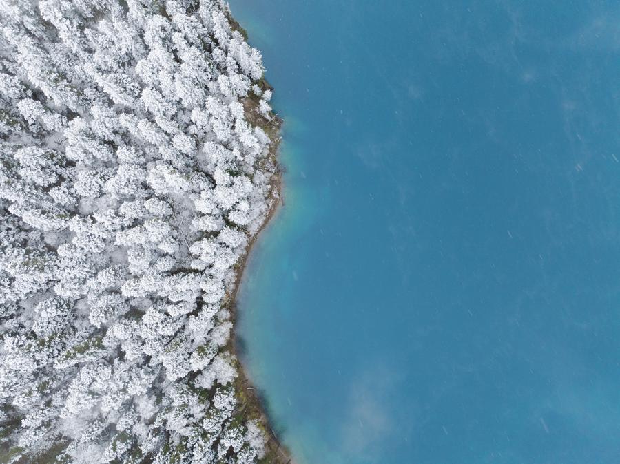 24日、雪化粧した九寨溝の湖「長海」。(ドローンから、九寨溝=新華社配信/桑吉)