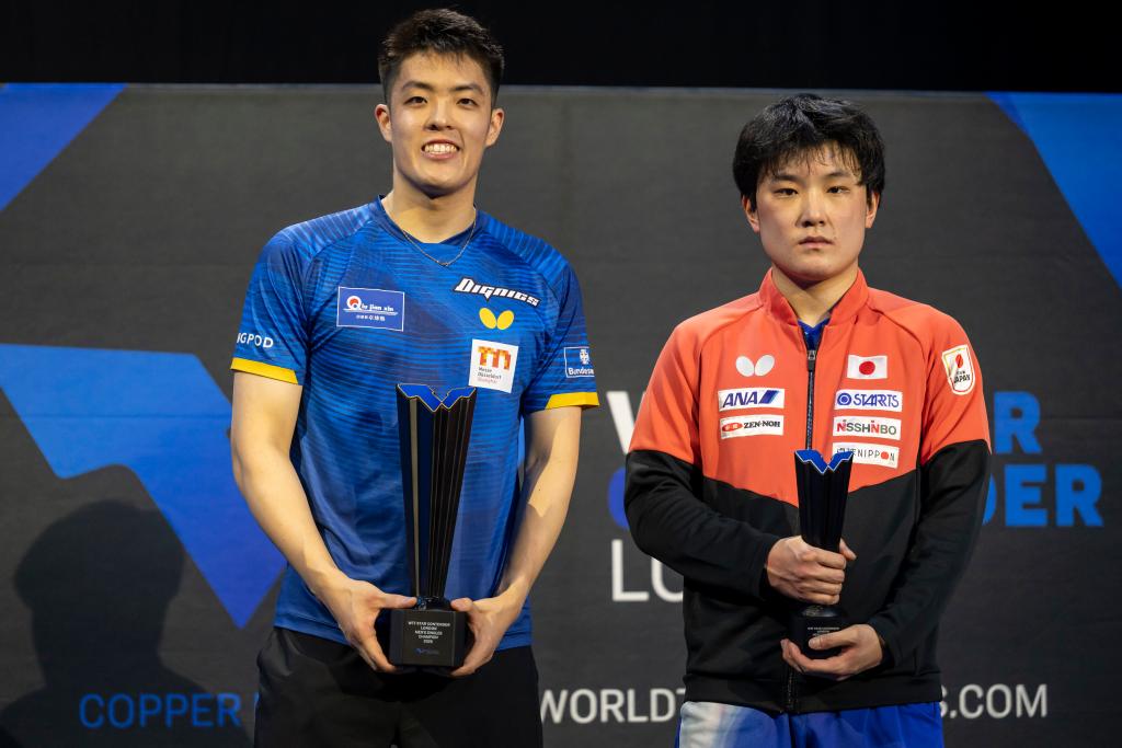 26日、表彰式に臨むチウ・ダン(左)と張本智和。(ロンドン=新華社配信)