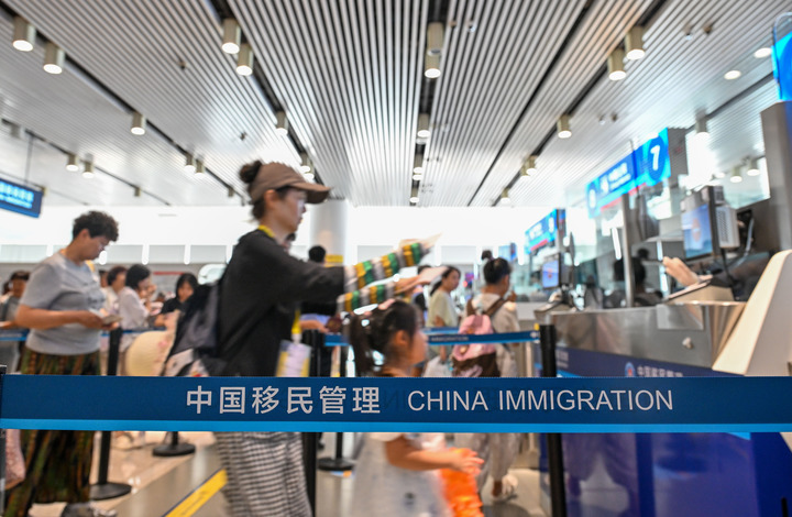 天津國際クルーズ船母港で入國手続きをする観光客。(7月15日撮影、天津=新華社記者/孫凡越)