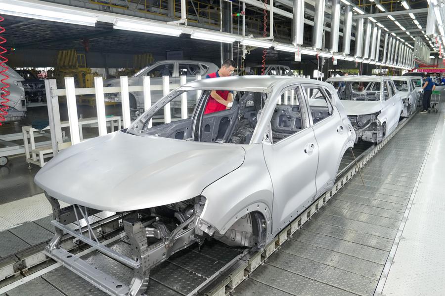 中韓(塩城)産業パークにある起亜と江蘇悅達集団の合弁會社、江蘇悅達起亜汽車の生産ラインで働く従業員。(10月16日撮影、塩城=新華社記者/李博)