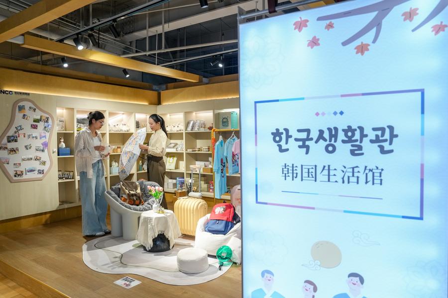 塩城中韓文化ホールの韓國生活館で商品を選ぶ観光客。(10月16日撮影、塩城=新華社記者/李博)