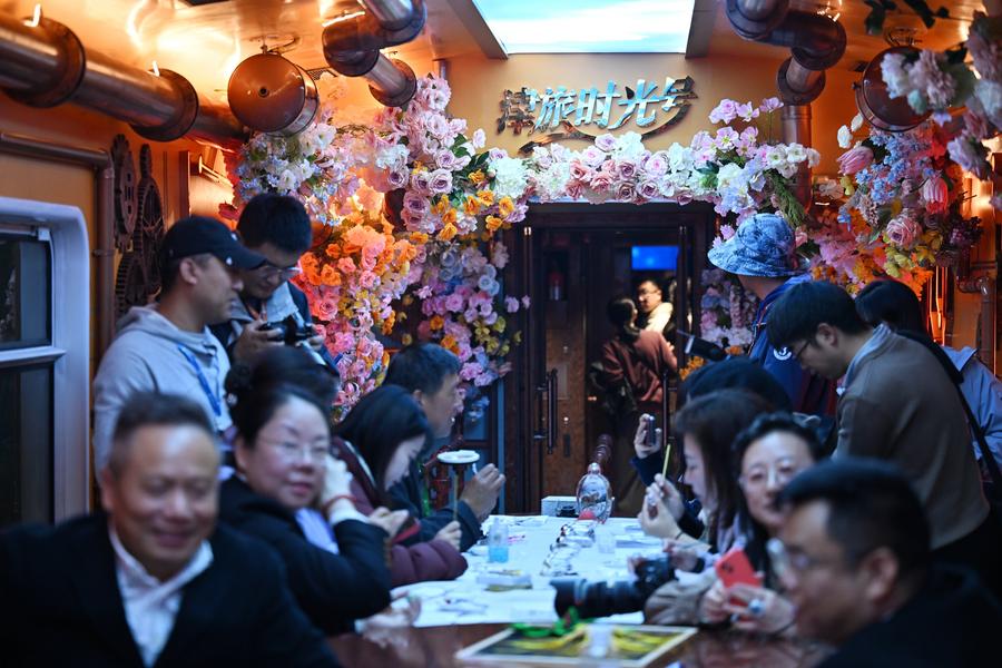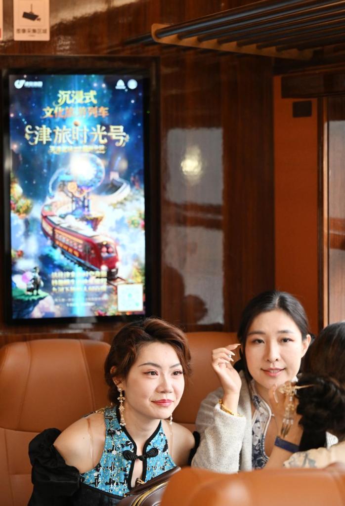 10月30日、テーマ型沒入體験観光列車「津旅時光號」の乗客。(天津=新華社配信)
