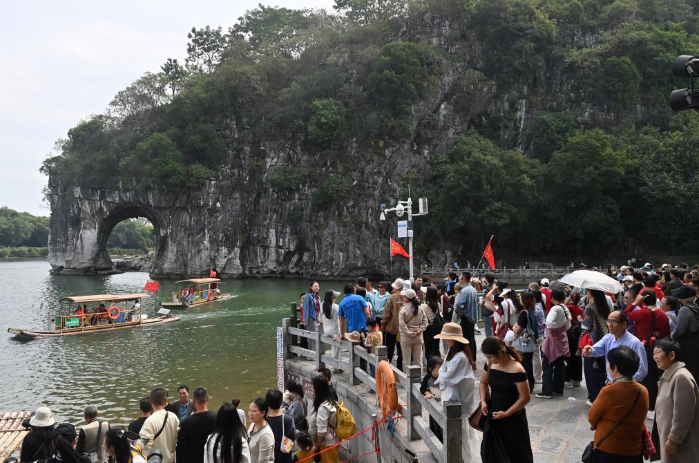 桂林市の象鼻山付近を散策する観光客。(10月25日撮影、桂林=新華社記者/陸波岸)