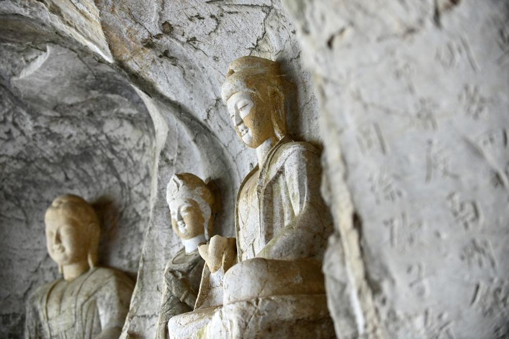 桂林市伏波山の還珠洞の壁に彫られた仏像。(10月25日撮影、桂林=新華社記者/陸波岸)