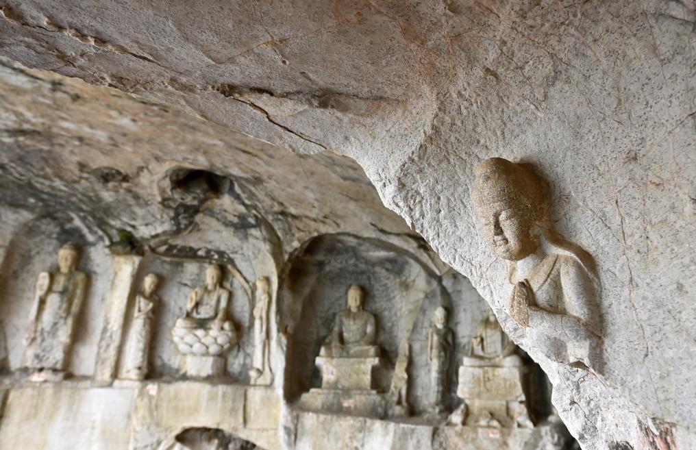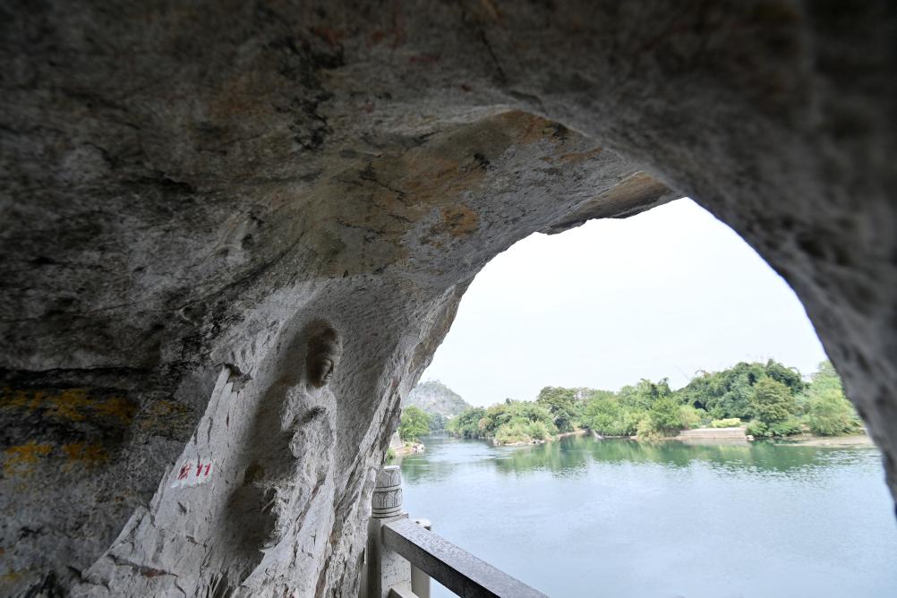 桂林市疊彩山の風洞の壁に彫られた仏像。(10月25日撮影、桂林=新華社記者/陸波岸)