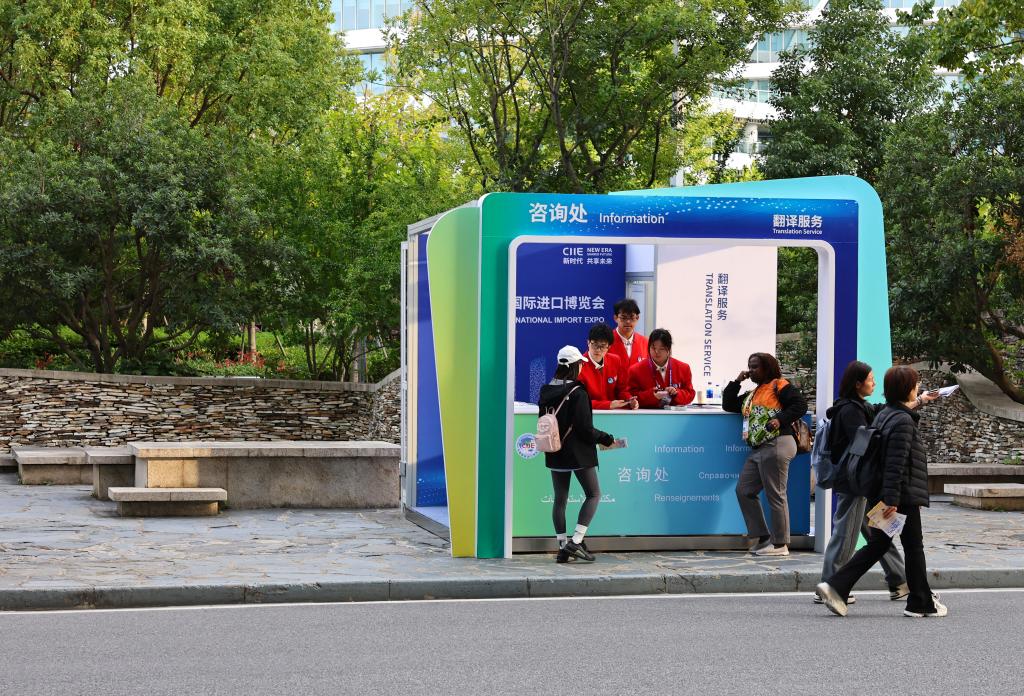 3日、上海市の國家エキシビション・コンベンションセンターに設置された輸入博の受付で作業するボランティア。(上海=新華社記者/方喆)