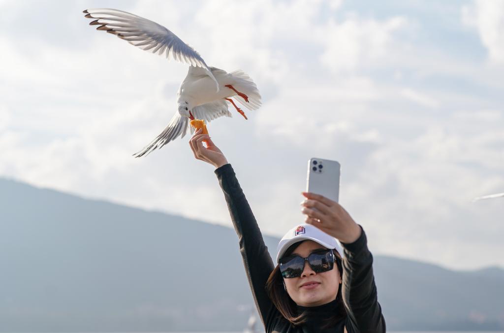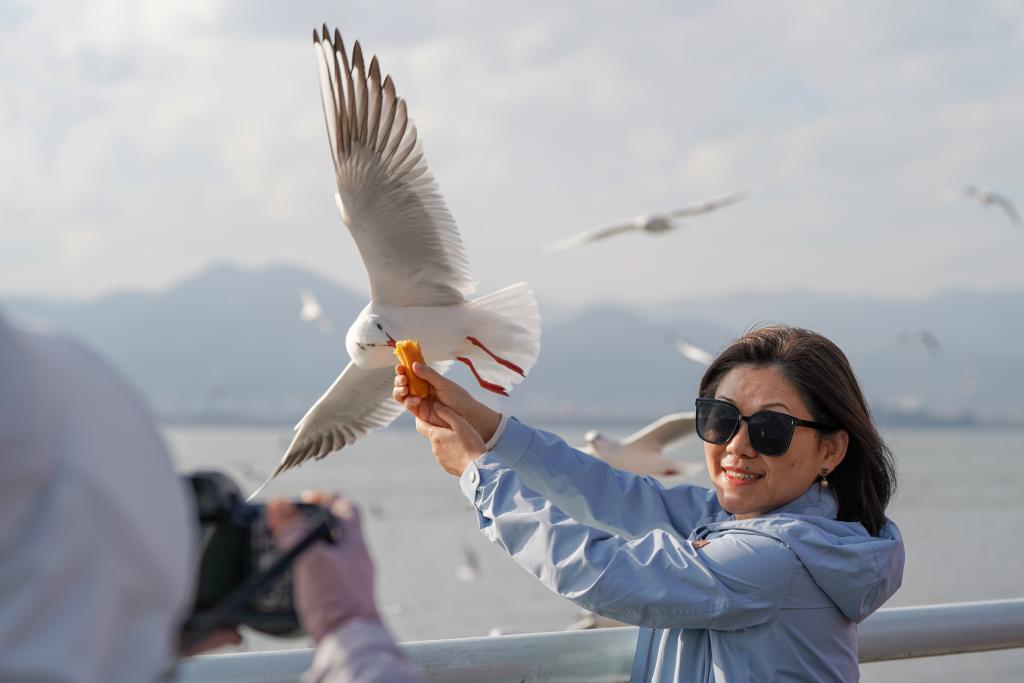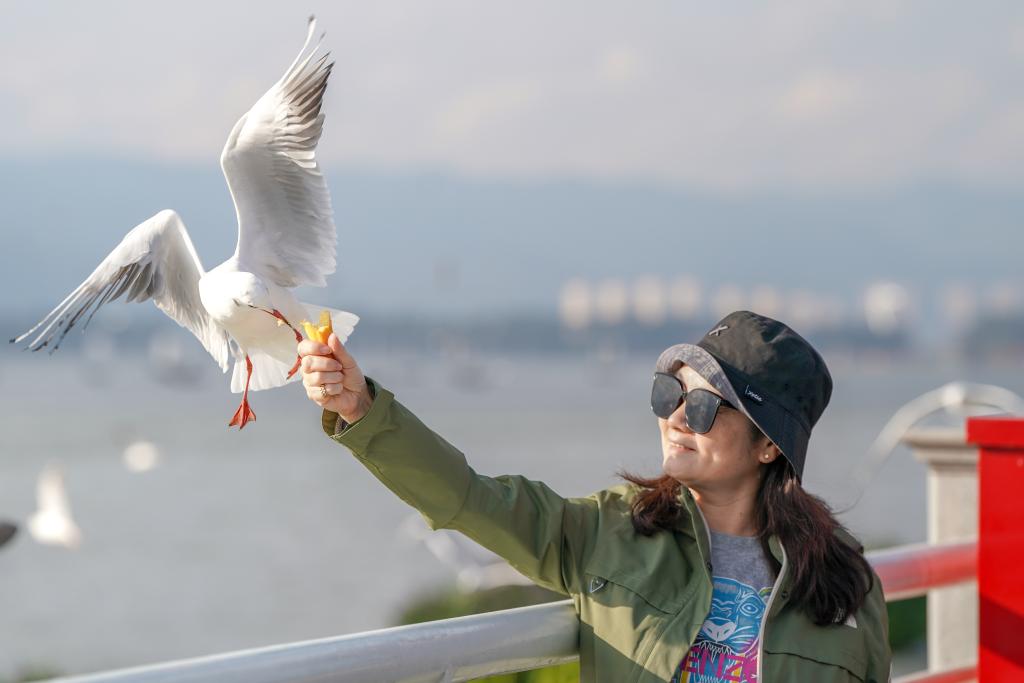 1日、昆明・滇池(てんち)の景勝地「海埂ダム」で、ユリカモメに餌をやる観光客。(昆明=新華社記者/彭奕凱)