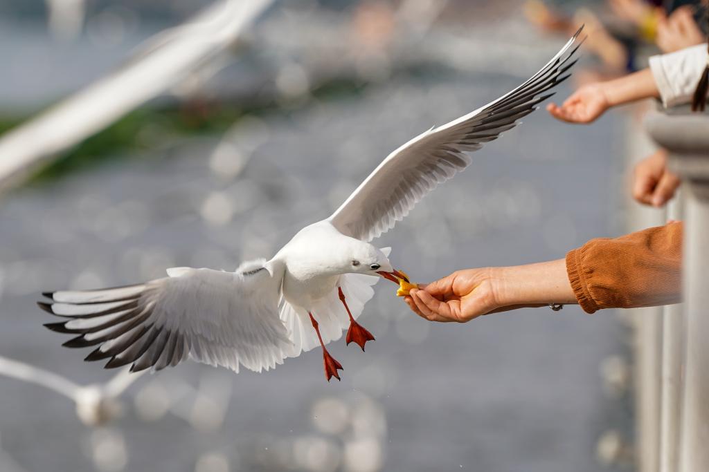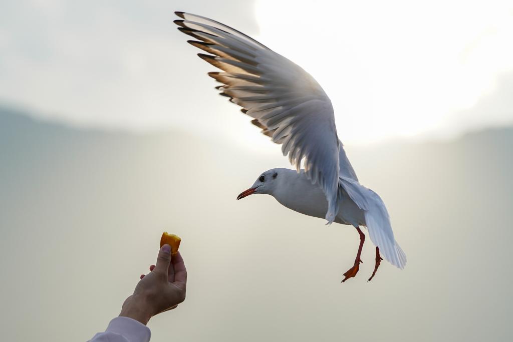 1日、昆明・滇池(てんち)の景勝地「海埂ダム」で、ユリカモメに餌をやる人。(昆明=新華社記者/彭奕凱)