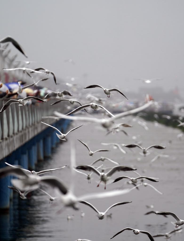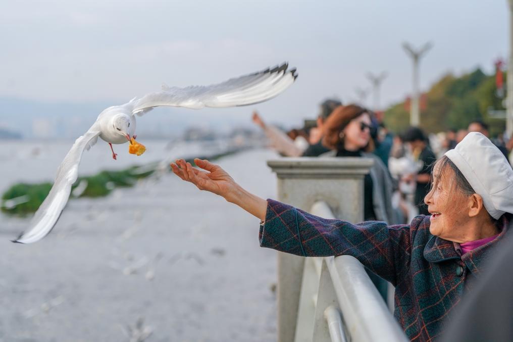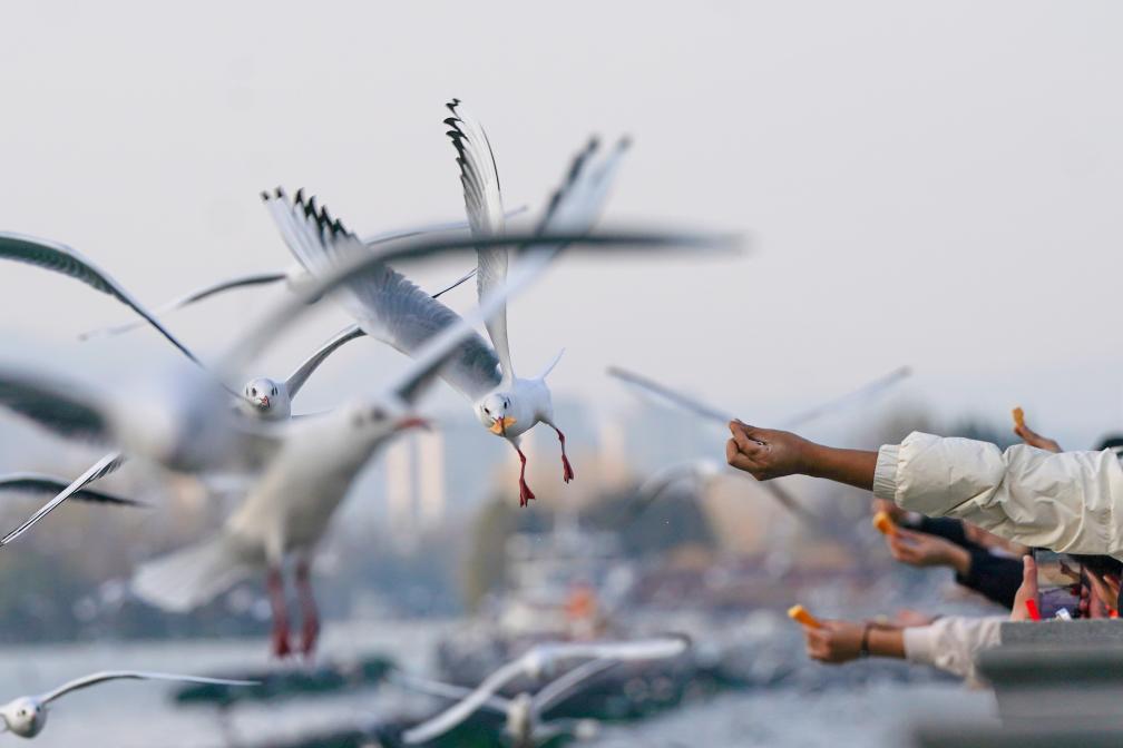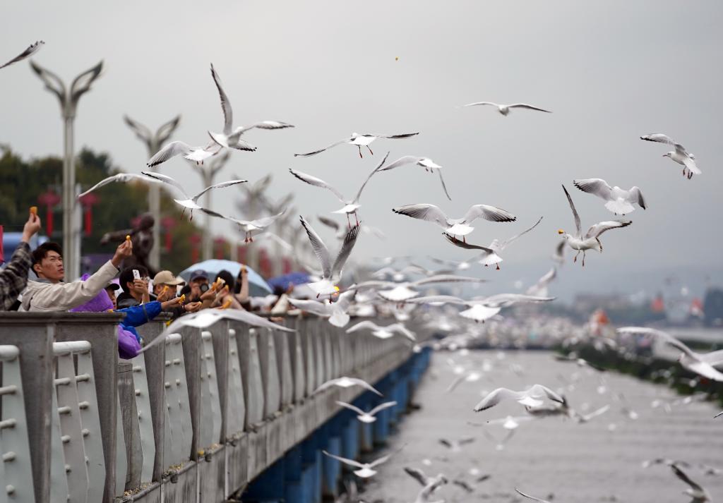 1日、昆明・滇池(てんち)の景勝地「海埂ダム」で、ユリカモメに餌をやる人たち。(昆明=新華社記者/彭奕凱)