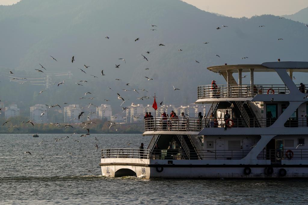 1日、昆明・滇池(てんち)で、遊覧船からユリカモメに餌をやる人たち。(昆明=新華社記者/彭奕凱)