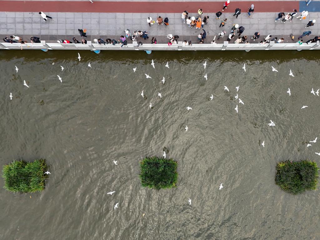 1日、昆明・滇池(てんち)の景勝地「海埂ダム」で、ユリカモメに餌をやる人たち。(ドローンから、昆明=新華社記者/彭奕凱)