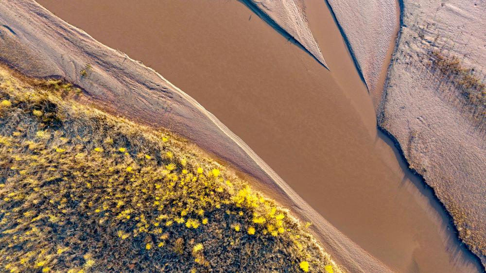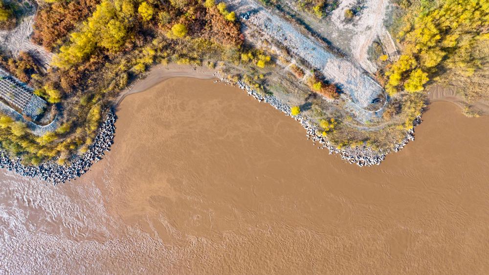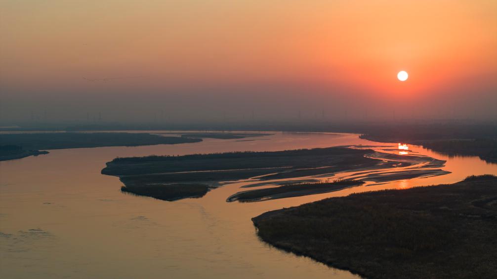 4日、寧夏回族自治區呉忠市利通區を流れる黃河。(ドローンから、銀川=新華社記者/楊植森)