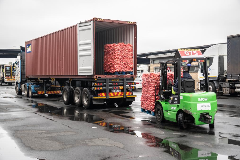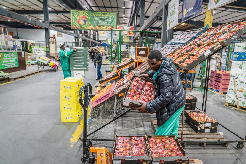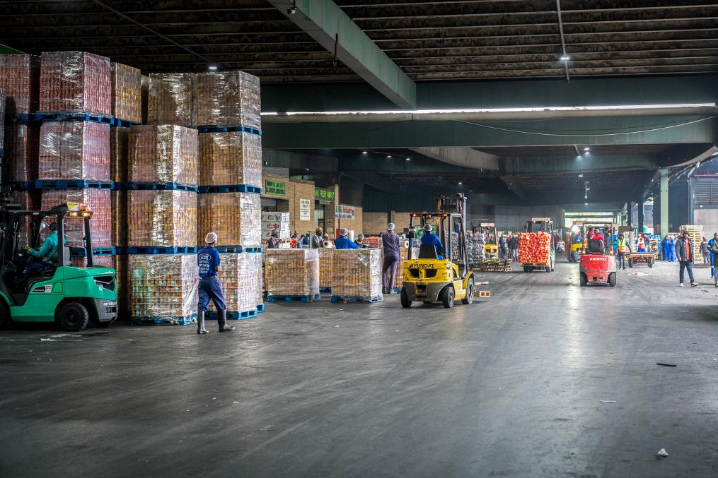 10月29日、南アフリカ・ヨハネスブルクの生鮮市場で、フォークリフトで果物をトラックに運ぶ作業員。(ヨハネスブルク=新華社配信)