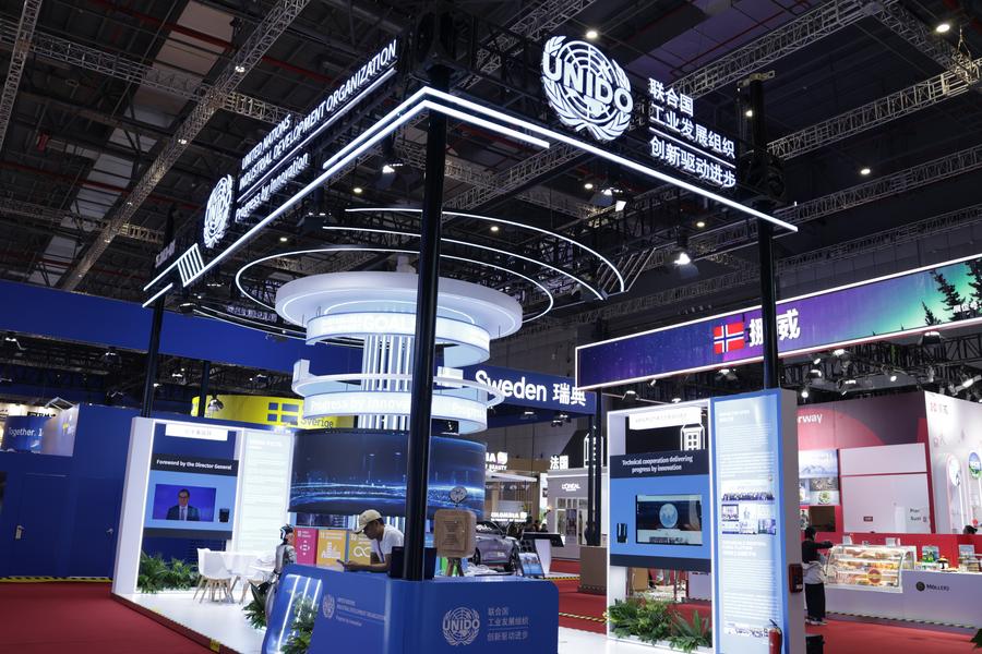 5日、國家総合展に設けられた國連工業開発機関(UNIDO)館。(上海=新華社記者/藍建中)