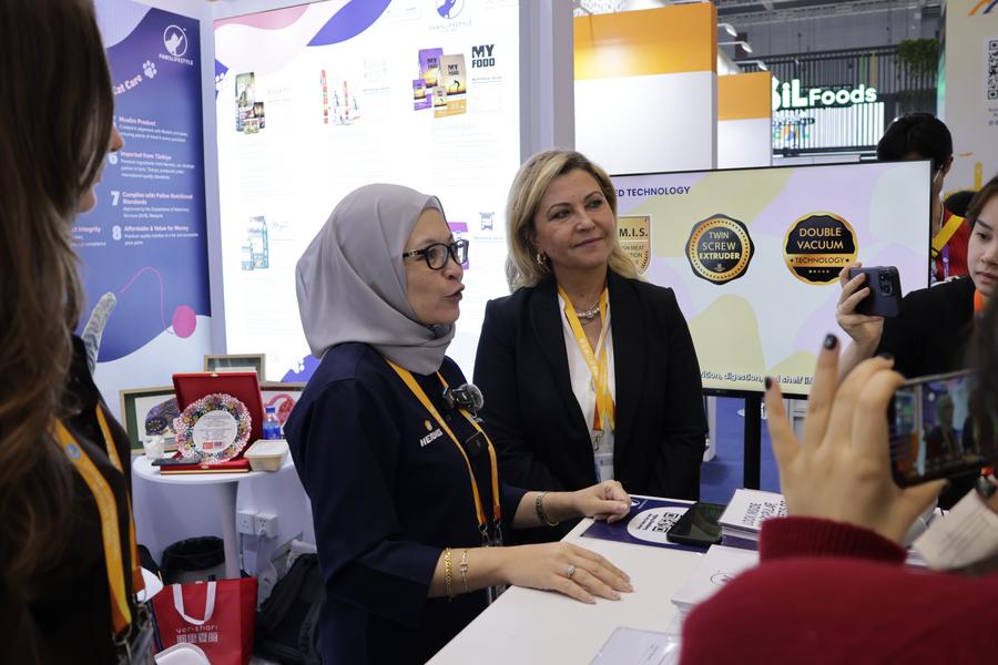 6日、マレーシアのパウズライフスタイルのブースでキャットフードを紹介する共同創業者のハズリナ・ハザニ氏(左)。(上海=新華社記者/藍建中)