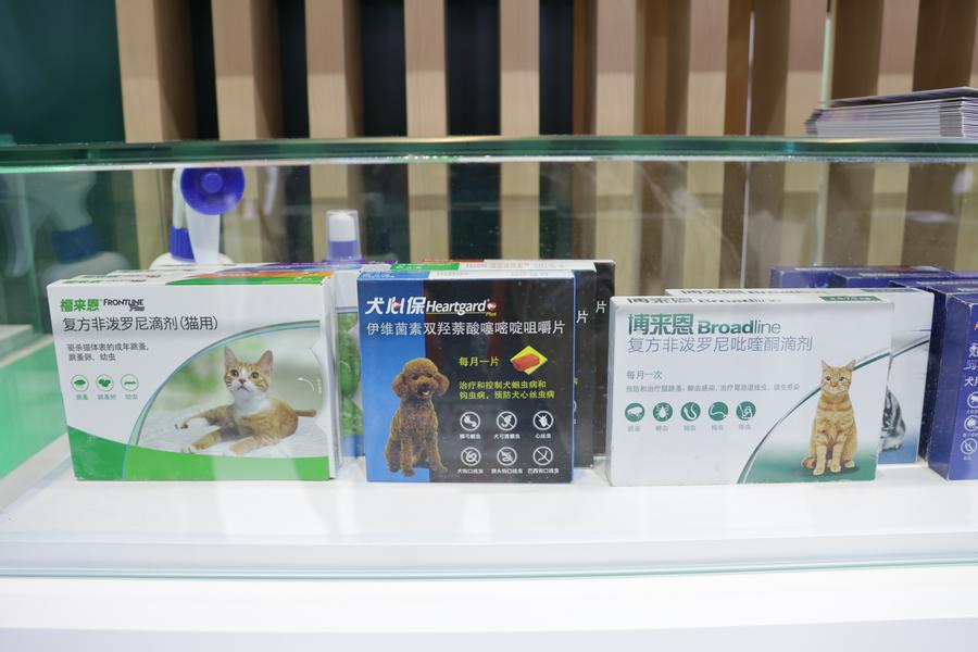 6日、米國の動物用醫薬品メーカー、メルク・アニマル・ヘルスが出展したペット用駆蟲薬。(上海=新華社記者/藍建中)
