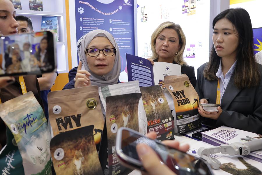 6日、マレーシアのパウズライフスタイルのブースでキャットフードを紹介する共同創業者のハズリナ・ハザニ氏。(上海=新華社記者/藍建中)