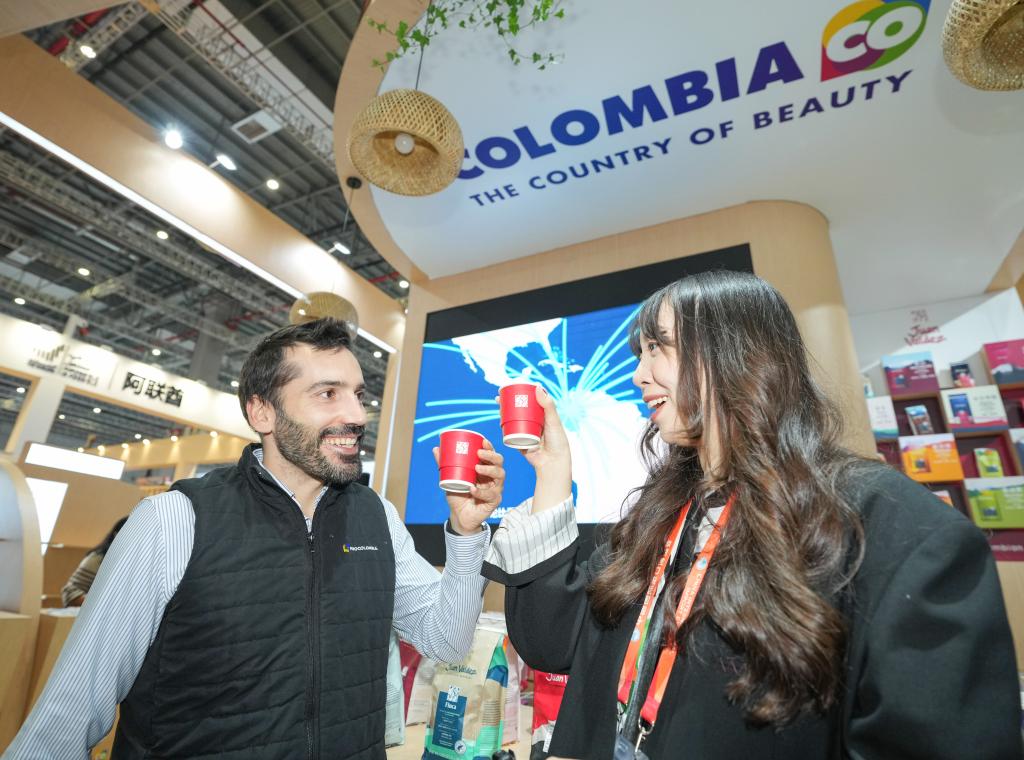 5日、第8回輸入博の國家展コロンビア館で、コーヒーを試飲する人たち。(上海=新華社記者/樊雨晴)