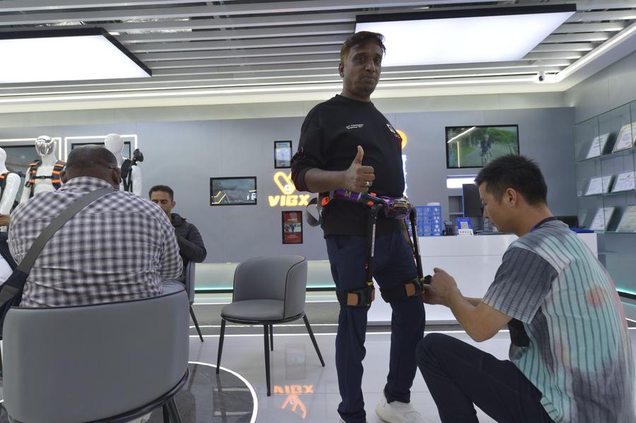 10月30日、浙江省義烏市のグローバルデジタルトレードセンター內にある店舗で、アシストスーツを試着する外國人バイヤー。(義烏=新華社記者/劉力航)